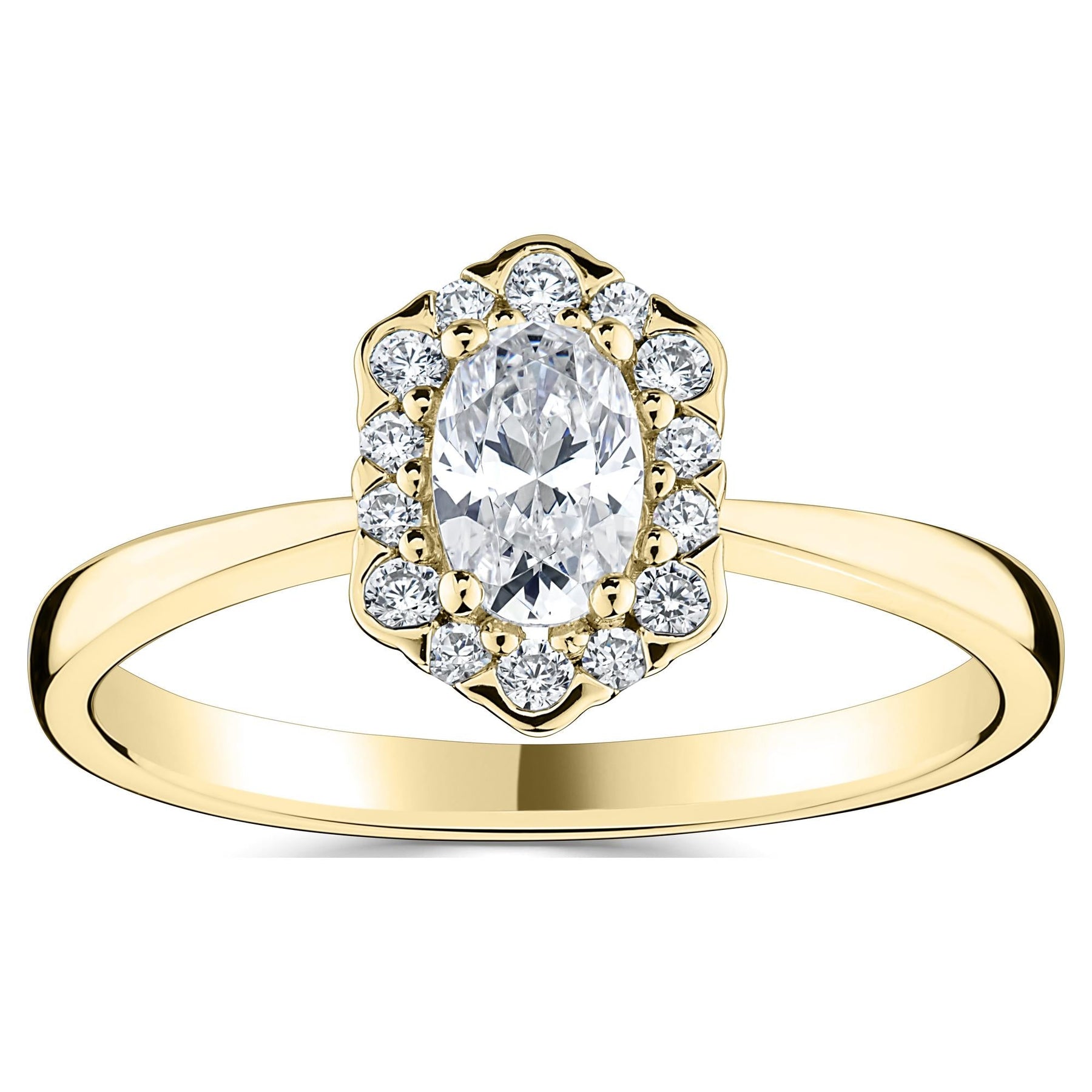 Oval halo engagement ring with 0.18ct diamond halo and plain shoulders.