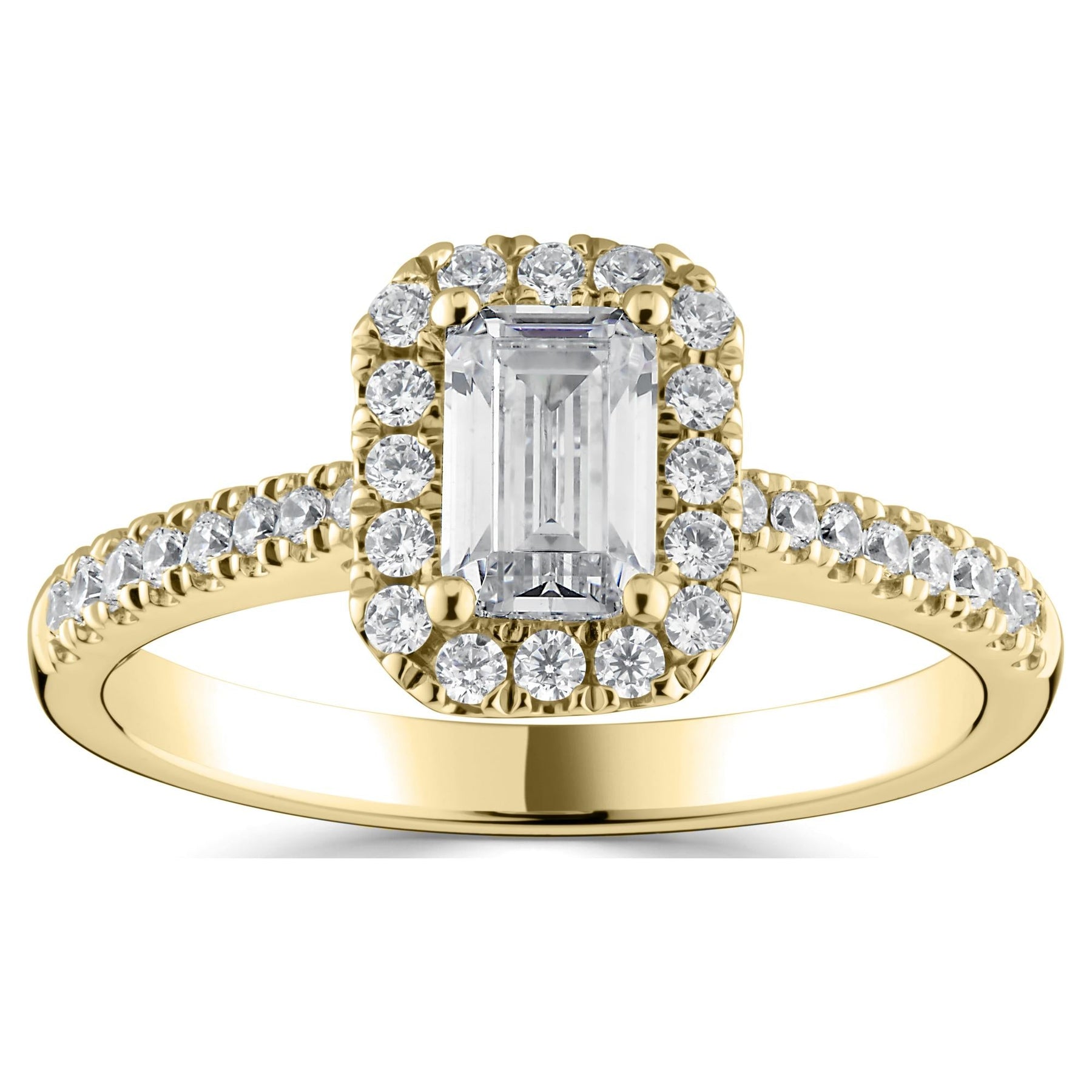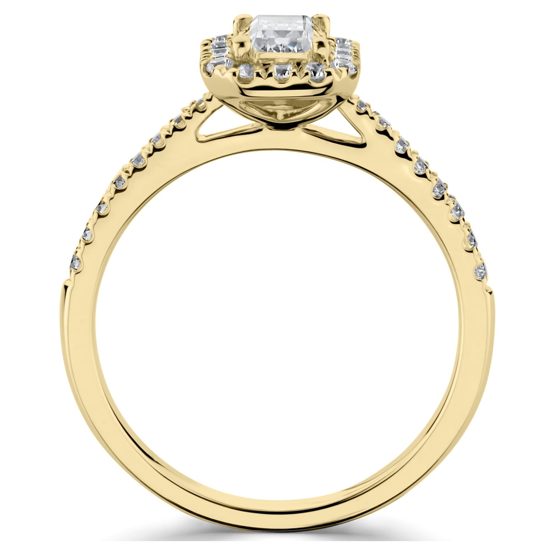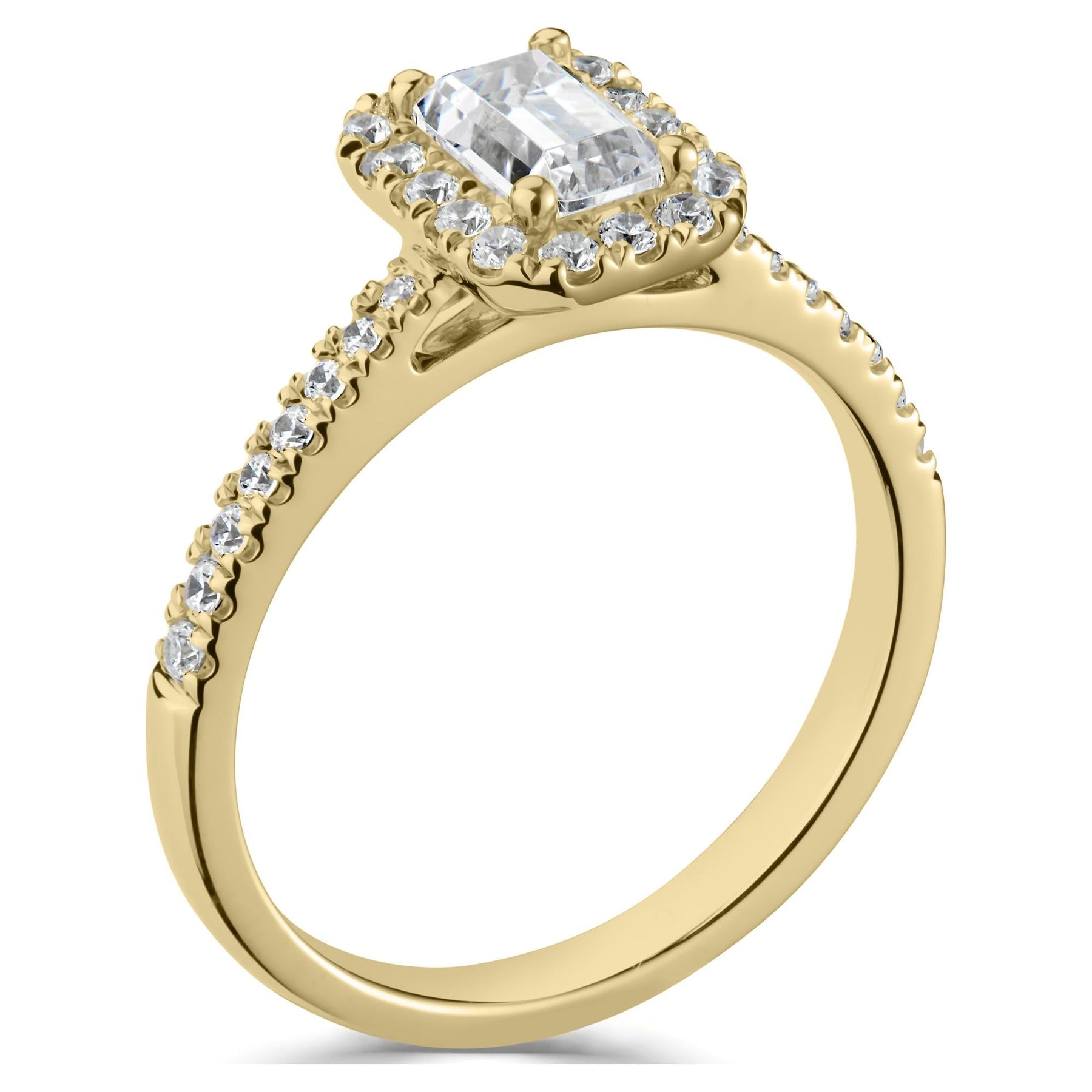 Emerald cut halo engagement ring with 0.27ct diamond halo and shoulders.
