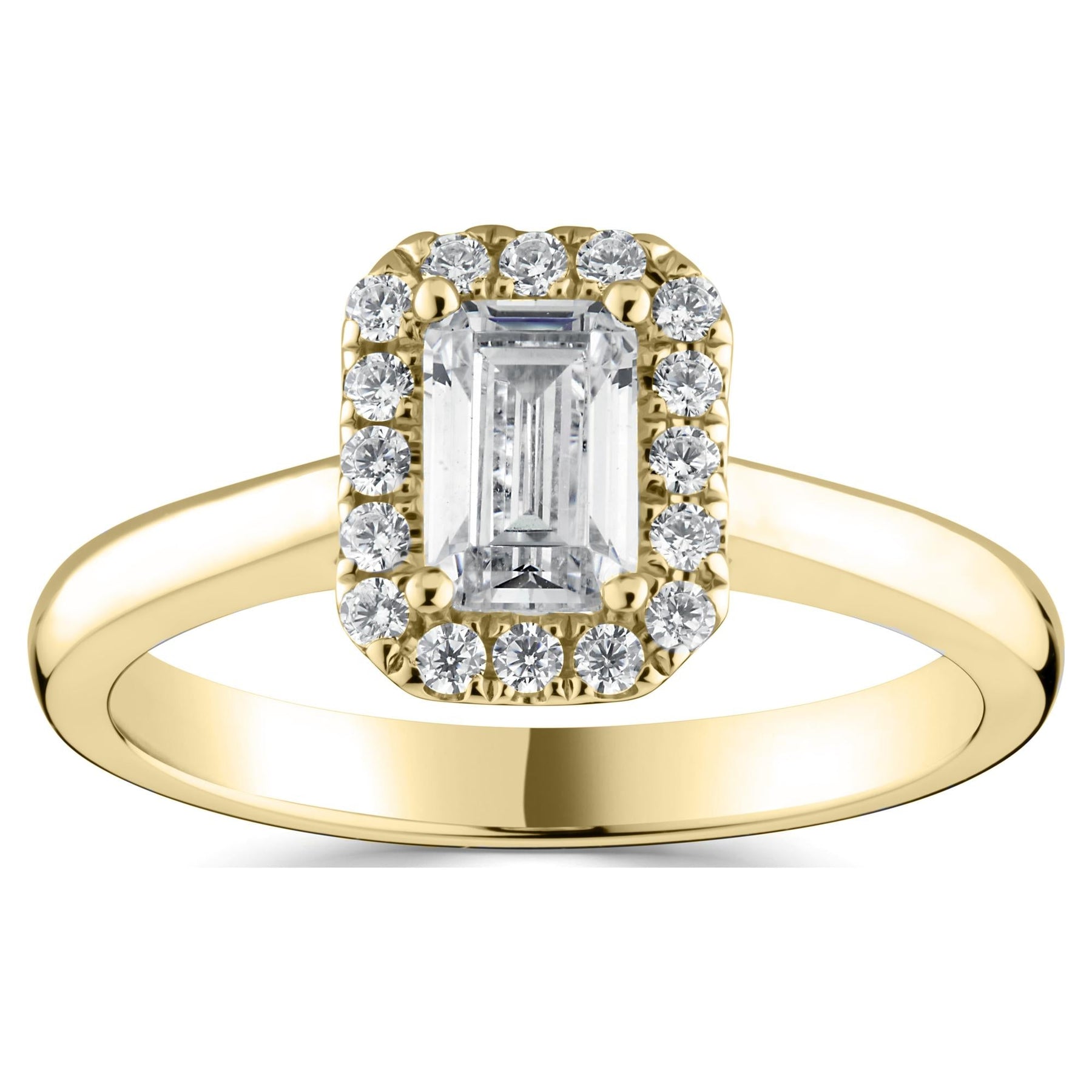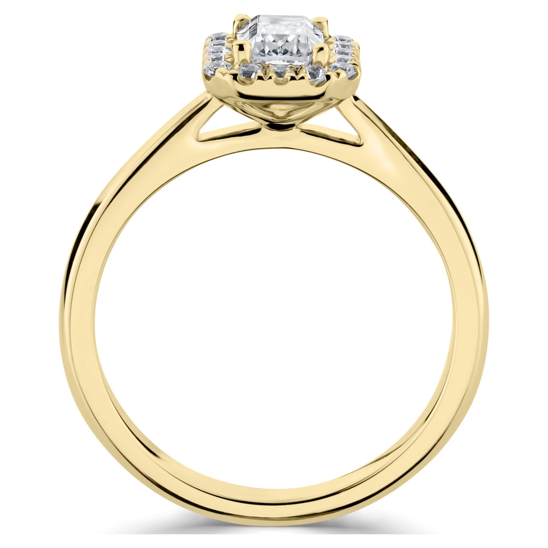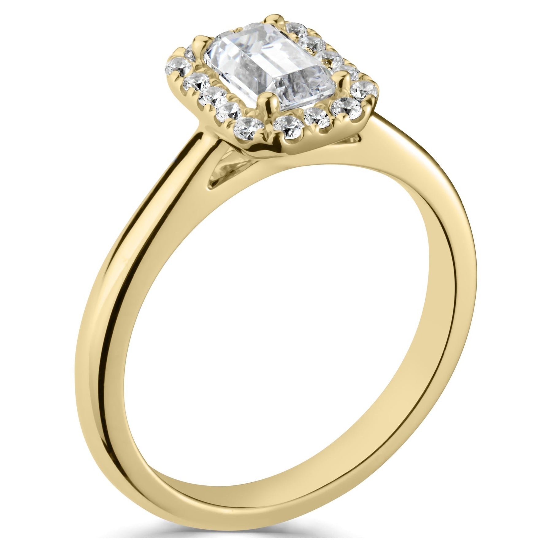 Emerald cut halo engagement ring with 0.14ct diamond halo and plain shoulders.