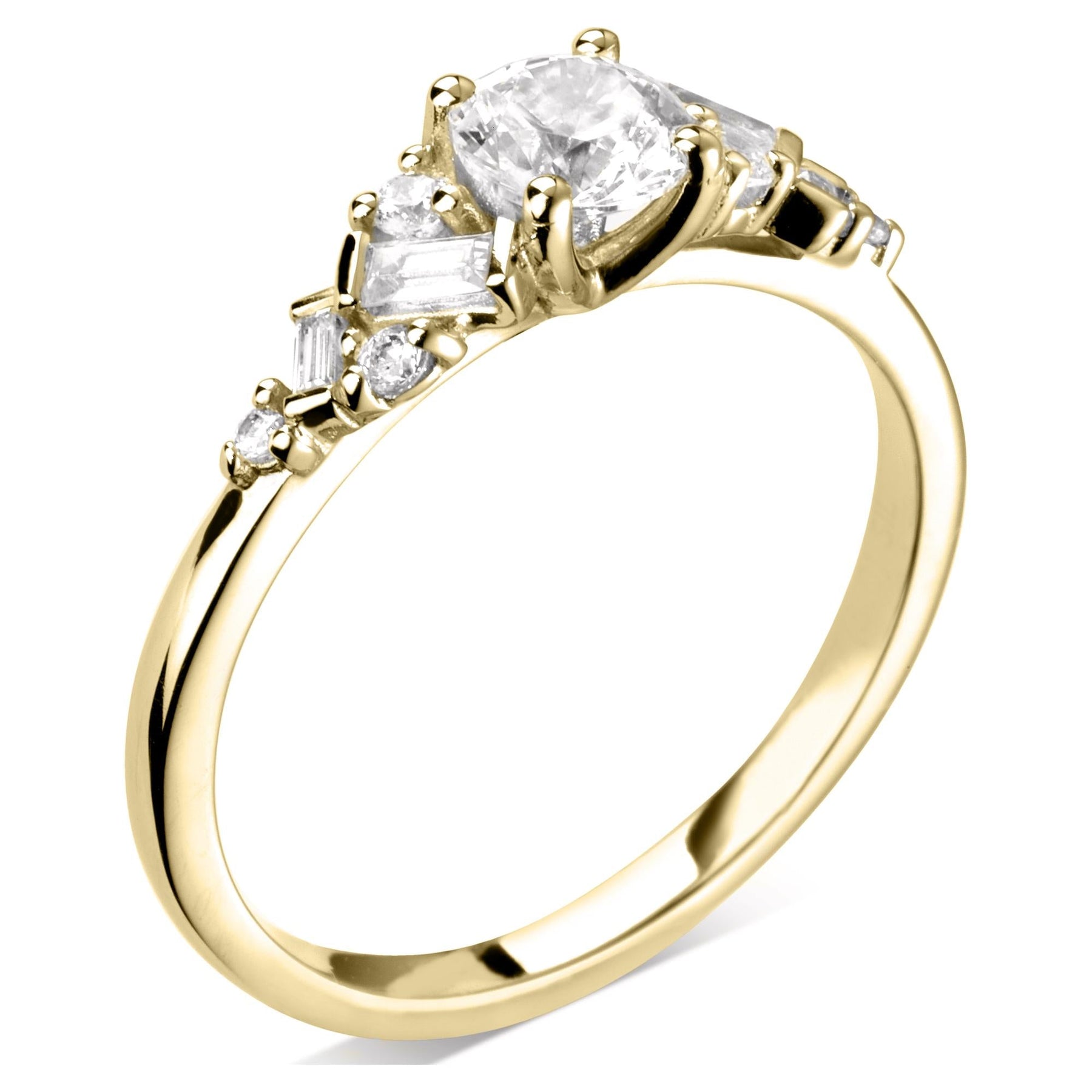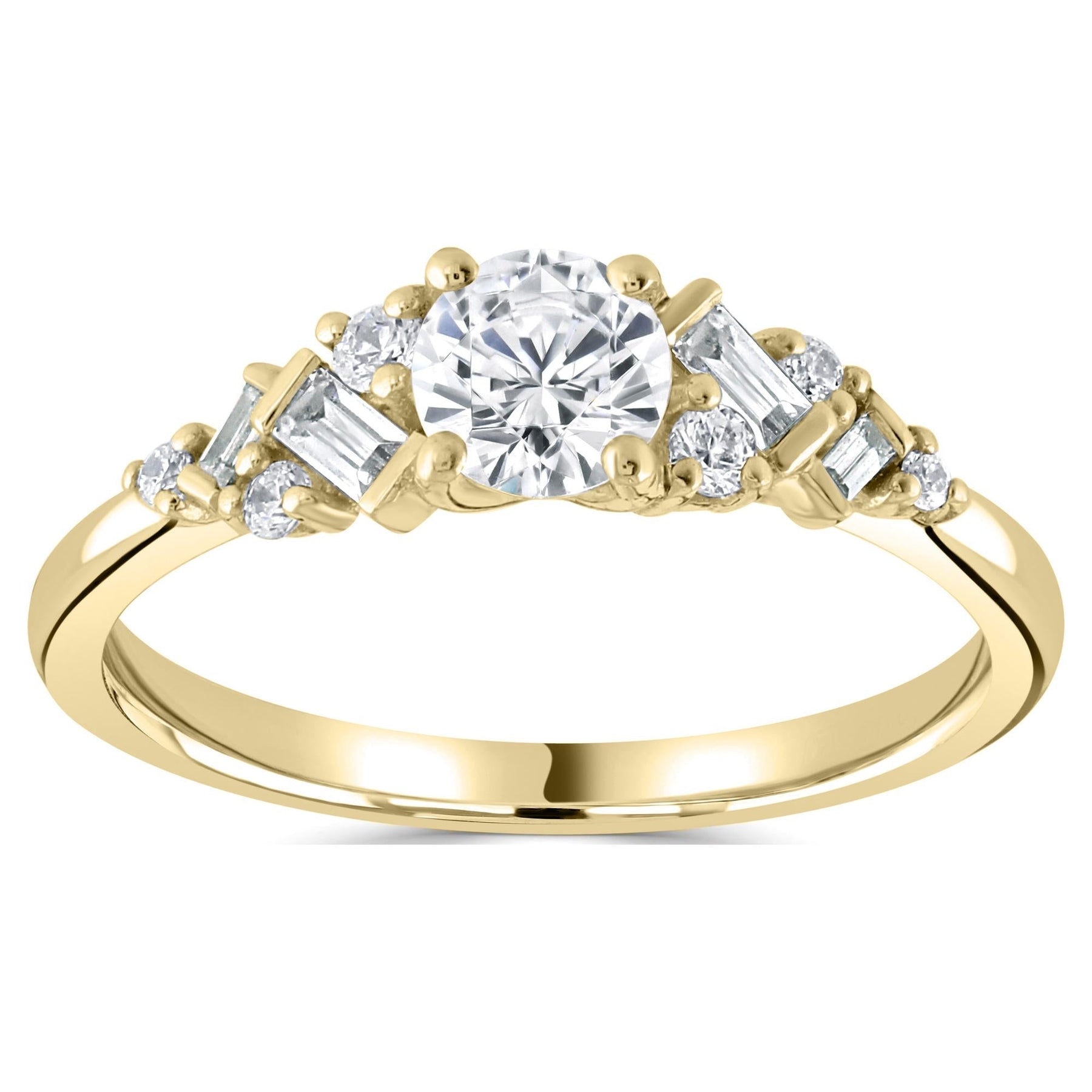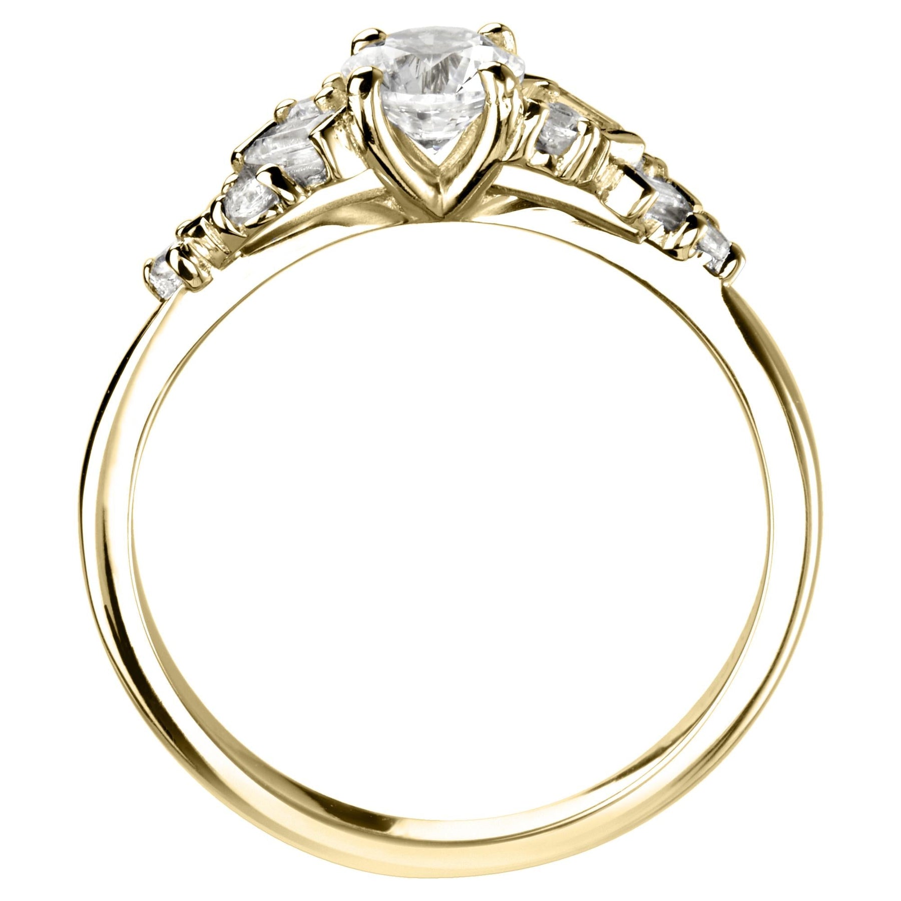 Round solitaire engagement ring with 0.22ct round and baguette bar and claw set diamond shoulders.