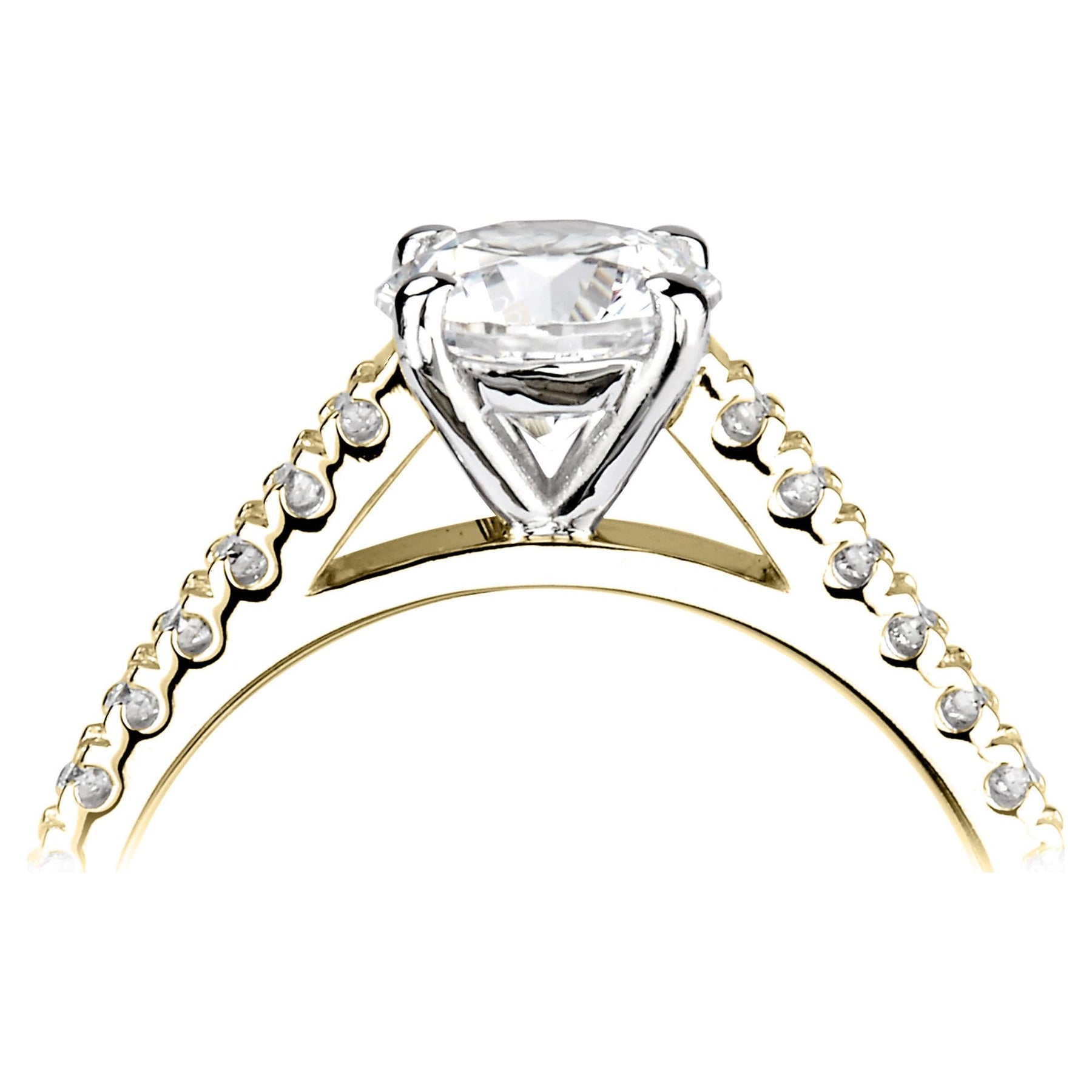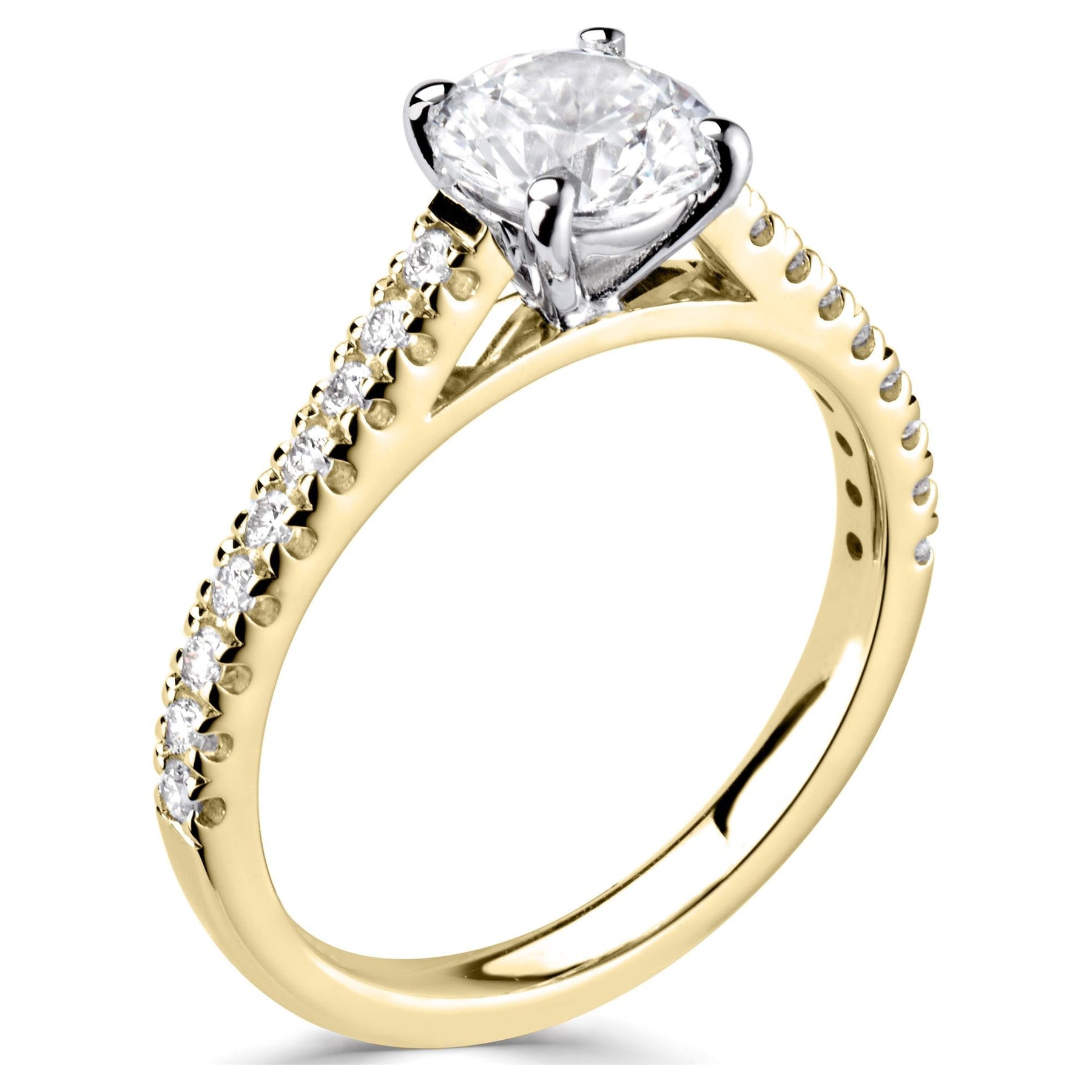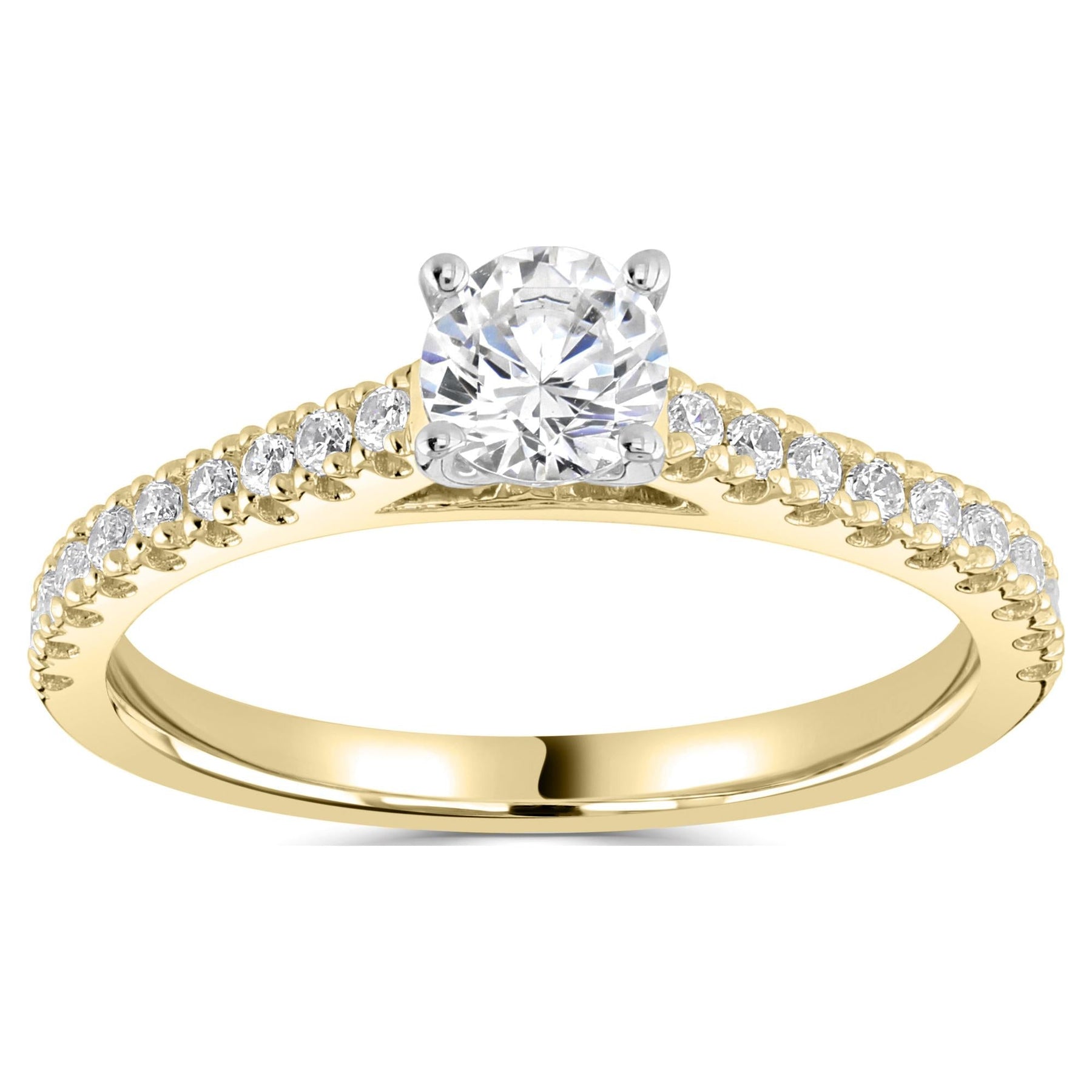 Round engagement ring with 0.12ct diamond halo and plain shoulders, yellow gold with platinum head.