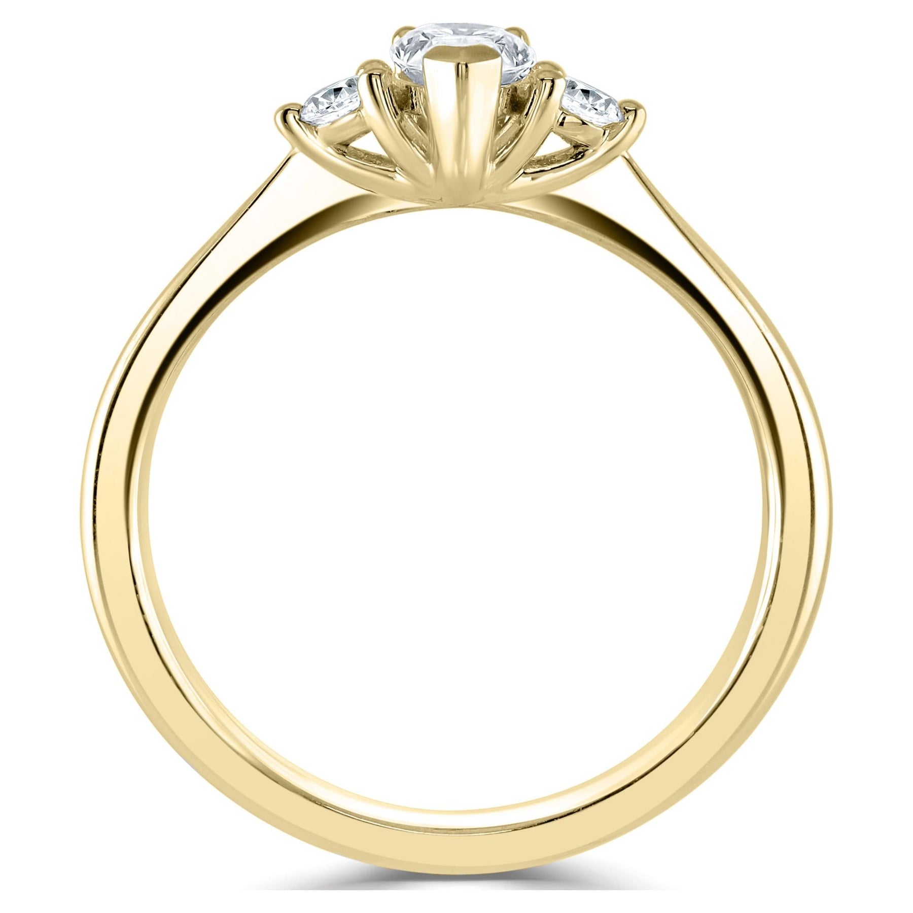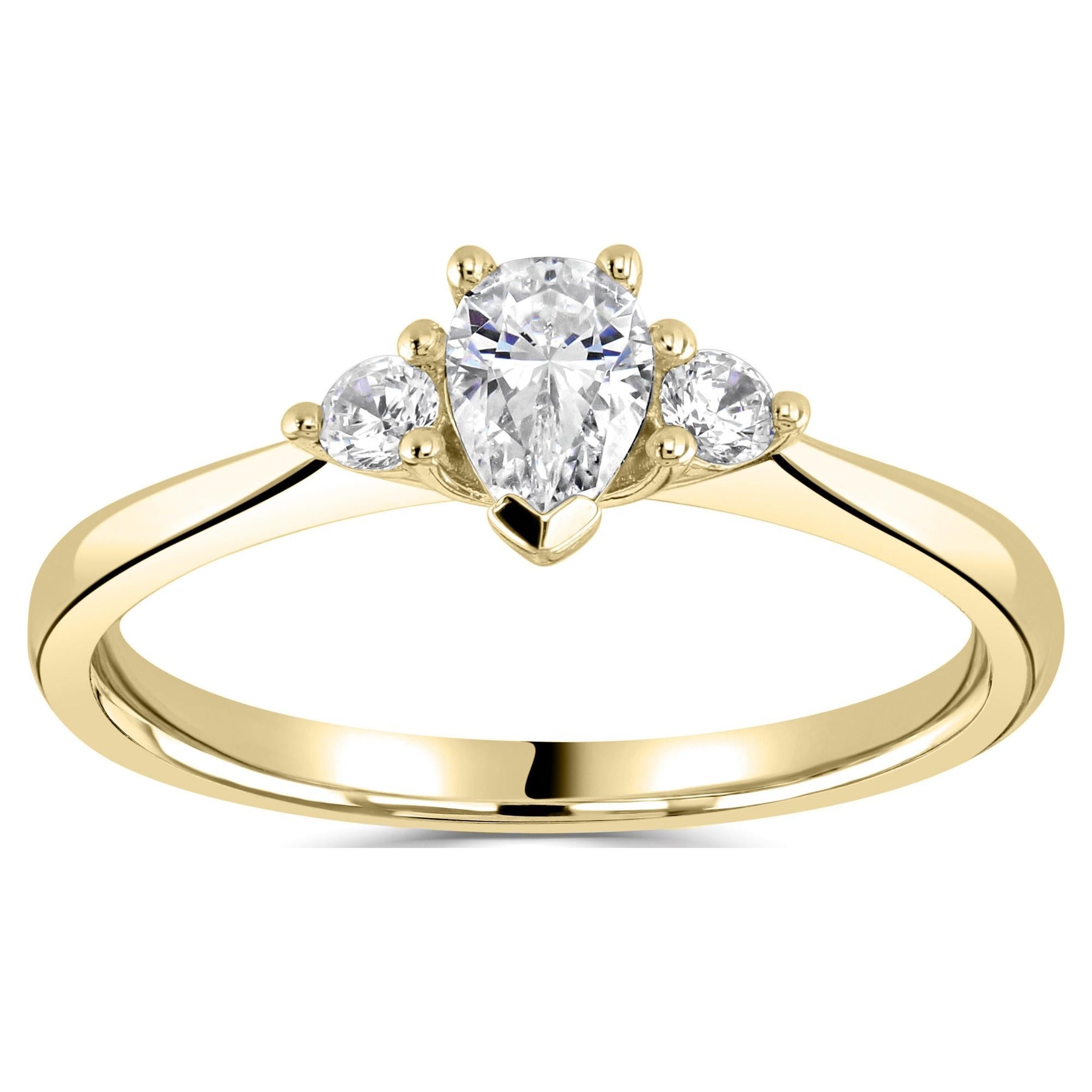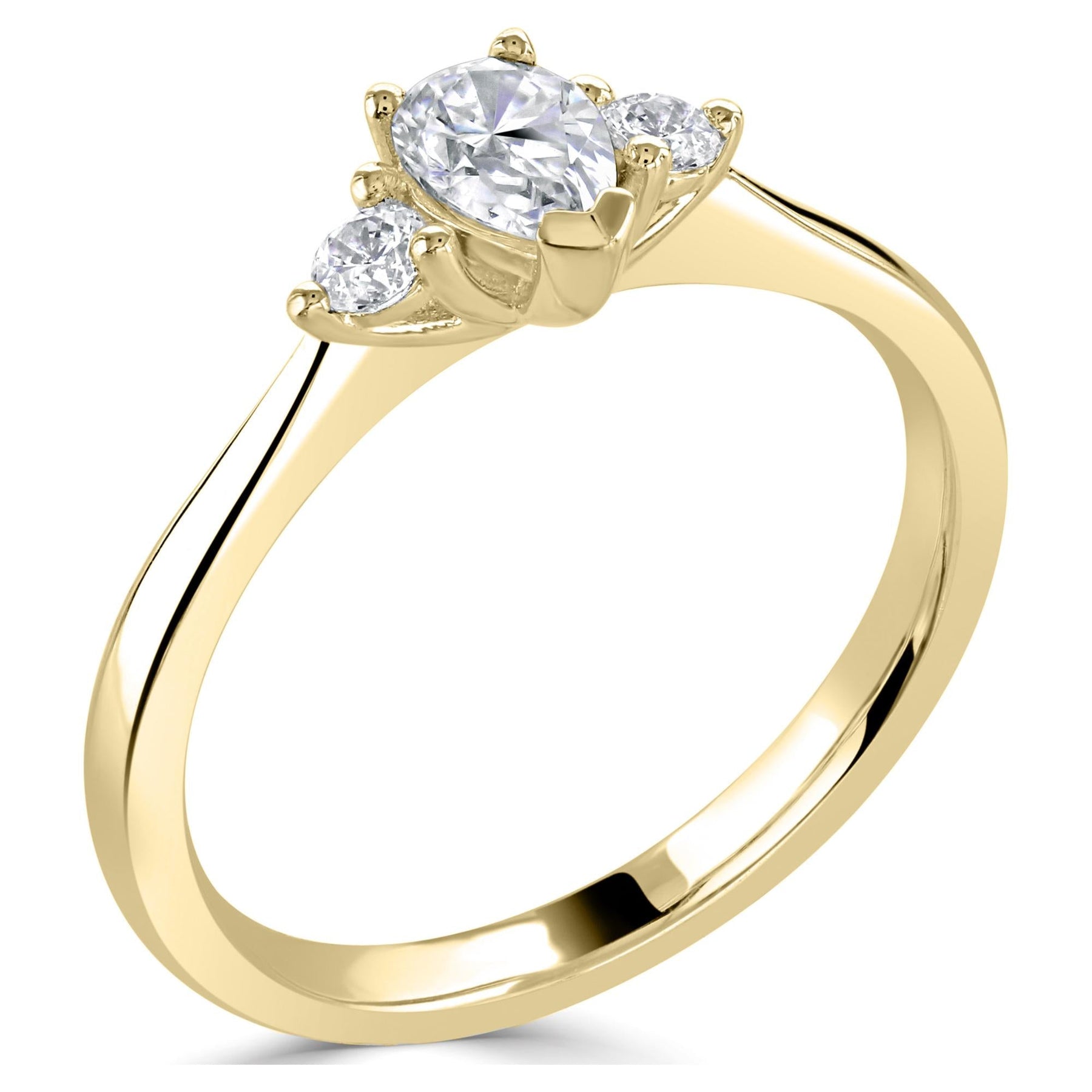 Pear shape trilogy engagement ring with plain shoulders, the round side diamonds will be H colour VS clarity, please call us should you require a different quality.