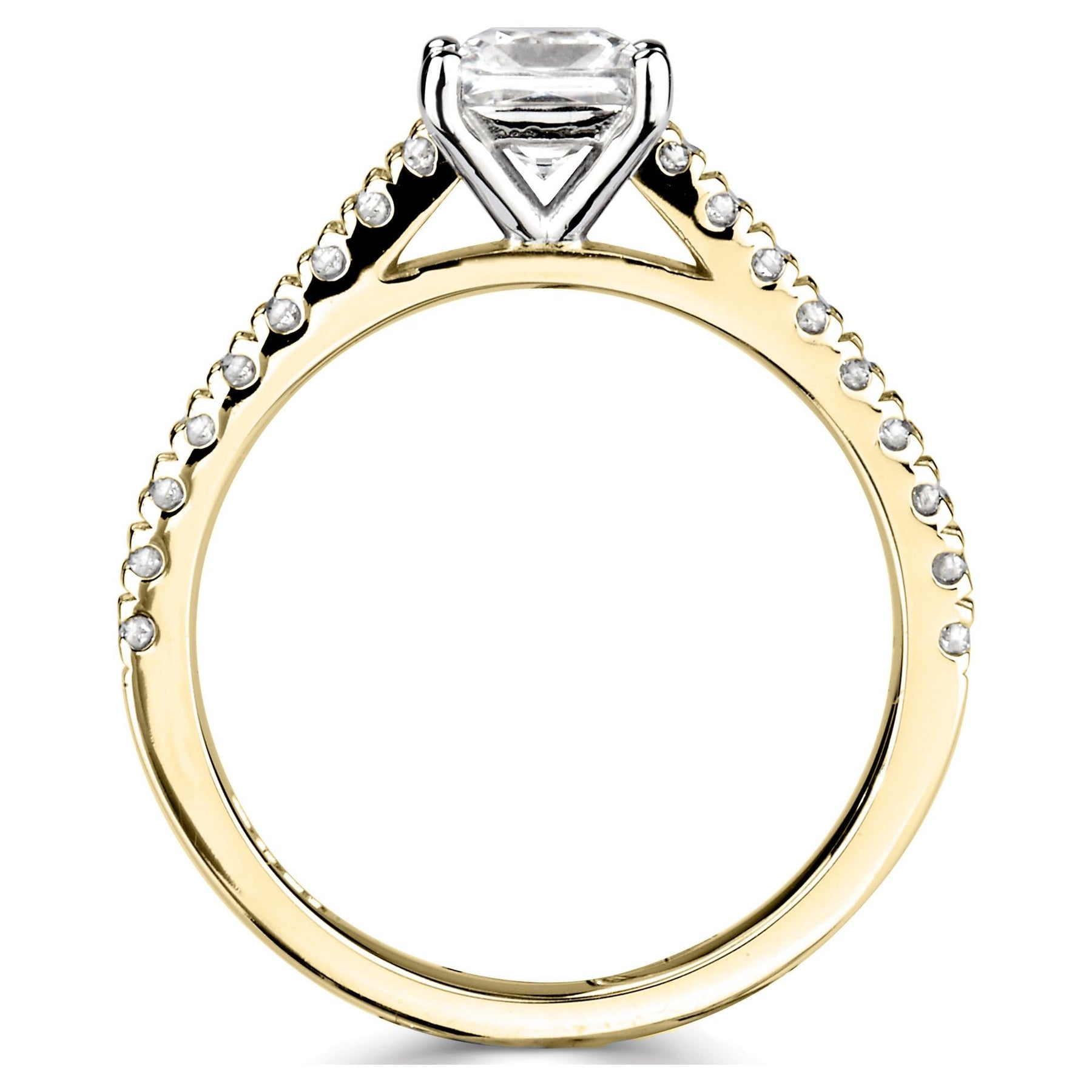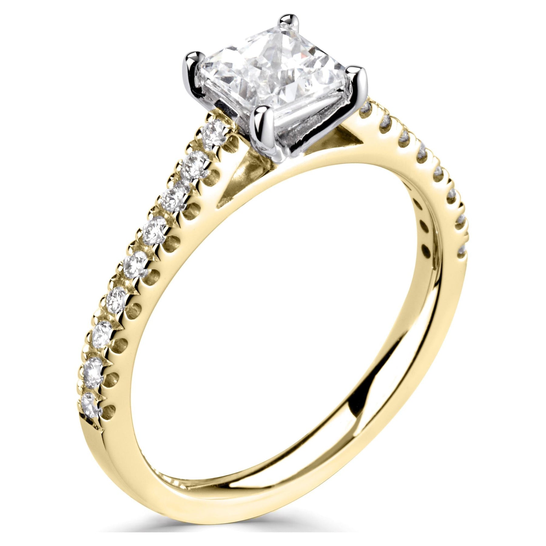 Princess cut engagement ring with 0.24ct diamond shoulders, yellow gold with platinum head.