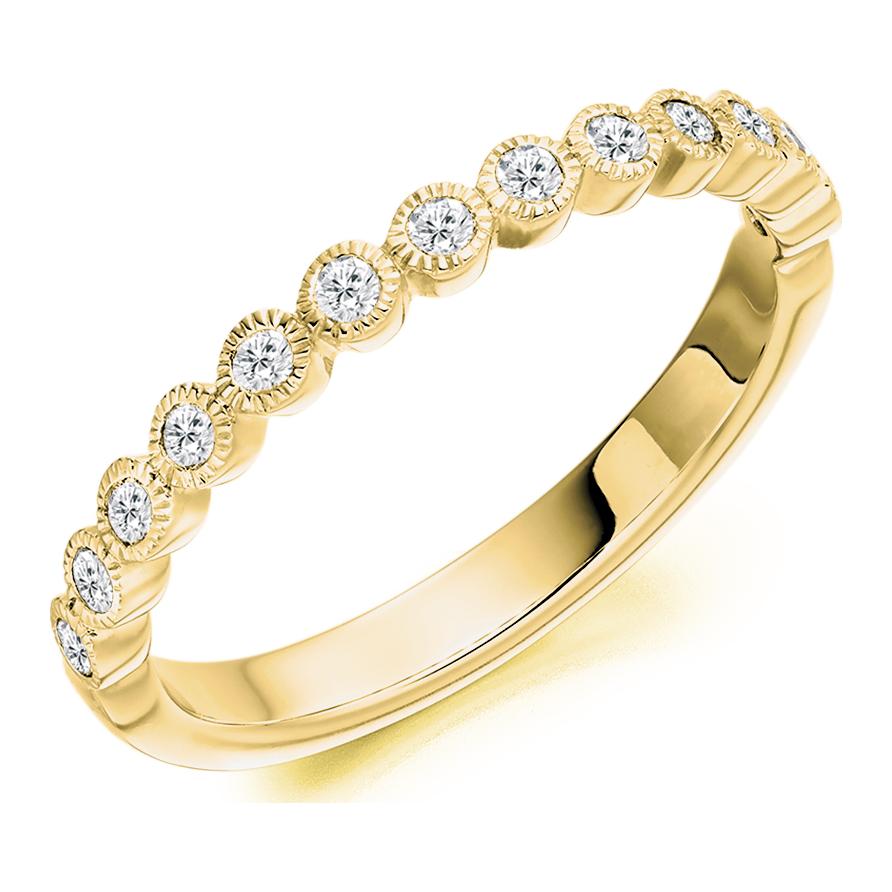 Vintage Rubover set Diamond Ring. 0.25ct Round Brilliant Cut Natural Diamonds. 50% Diamond Coverage. Approximate Ring Width 2.3mm.