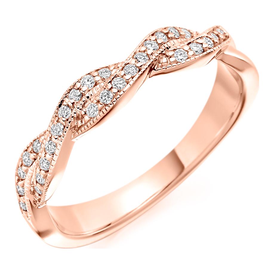 Shaped Diamond Twist Wedding Ring. 0.22ct Round Brilliant Cut Diamonds. 40% Diamond Coverage. Approximate Ring Width 3.9mm.