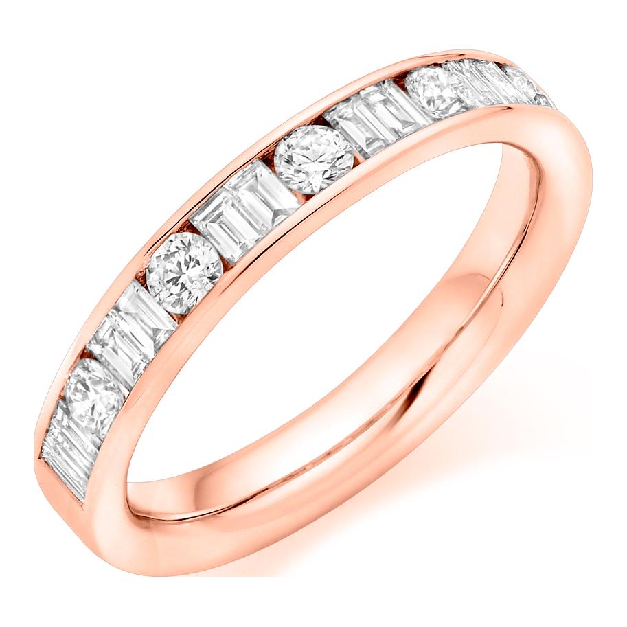 Channel Set Diamond Ring. 0.75ct Round Brilliant and Baguette Cut Diamonds. 50% Diamond Coverage. Approximate Ring Width 3.4mm.