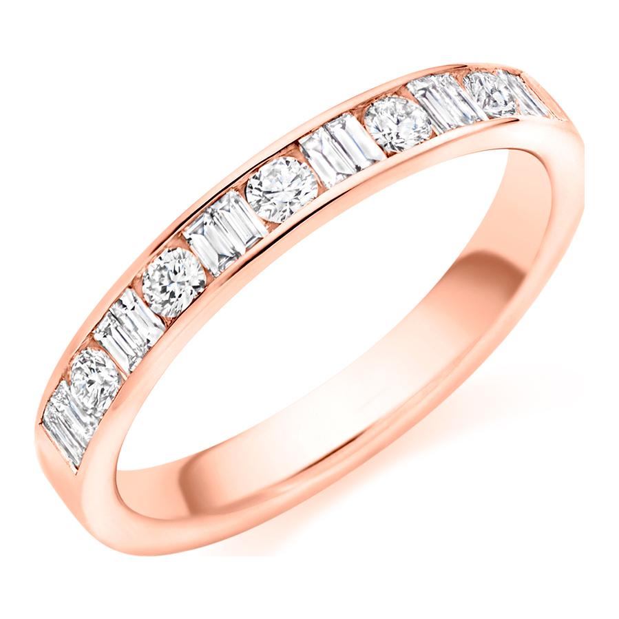 Channel Set Diamond Ring. 0.50ct Baguette and Round Brilliant Cut Diamonds. 45% Diamond Coverage. Approximate Ring Width 3.1mm.