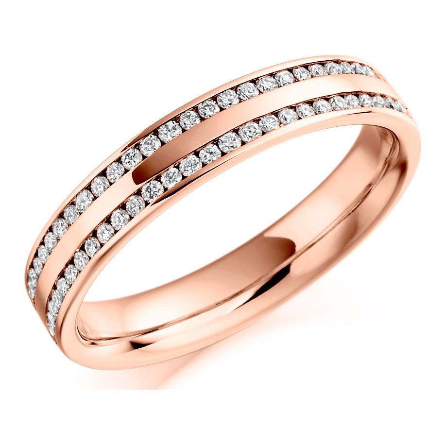 Double Row Channel Set Diamond Ring. 0.26ct Round Brilliant Cut Diamonds. 50% Diamond Coverage. Approximate Ring Width 3.8mm.